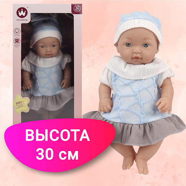 Милое платьице выполнено в нежных голубых и серых тонах и может сниматься, что позволит ребенку самостоятельно переодевать куклу. Дополнением к образу служит очаровательная шапочка из мягкой и приятной на ощупь ткани.