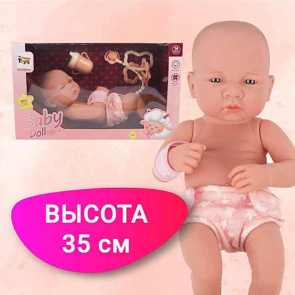 Реалистичный пупс вызовет искренний восторг у ребенка старше 3 лет. Игрушка привлекает внимание тщательной детализацией, имеет потрясающее сходство с новорожденным малышом. Подгузник и бирка на запястье усиливают сходство. Усложнить игру позволят дополнительные аксессуары и интерактивные функции. В набор входит пустышка, погремушка и поильник.