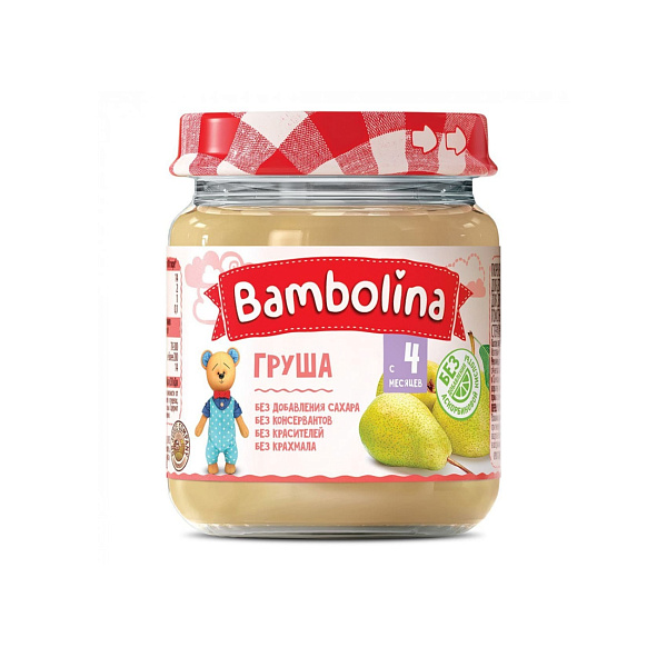Фруктовый десерт из спелой груши Bambolina отличается сладким вкусом и нежной консистенцией. Пюре из груши с пониженной кислотностью обладает мочегонным действием, способствует укреплению иммунитета. Сладость пюре придает содержащаяся в грушах фруктоза.