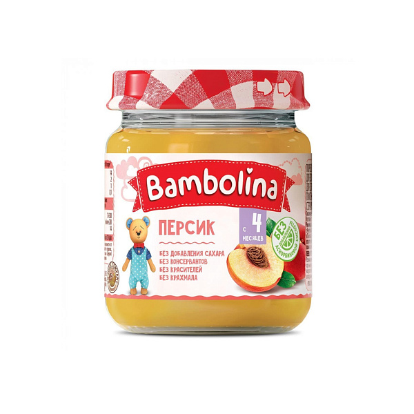 Фруктовое пюре Bambolina из персика станет любимым лакомством малыша. Полезный и вкусный десерт изготовлен из сладких, ароматных персиков. Фрукт содержит фосфор и кальций, которые укрепляют опорно-двигательный аппарат, уменьшают риск развития рахита. Витамин С полезен для иммунитета и сердечно-сосудистой системы. Продукт рекомендован для детей с 4 месяцев.