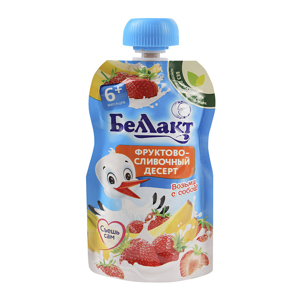 Фруктово-сливочный десерт «Беллакт» со вкусом банан-клубника представлен в удобной упаковке мягкой упаковке объемом 90 г. Состав десерта включает только натуральные ингредиенты: пюре банана, пюре клубники и сливки. Природные сахара из фруктов и отсутствие консервантов и крахмала делают продукт безопасным и полезным для малышей с 6 месяцев.