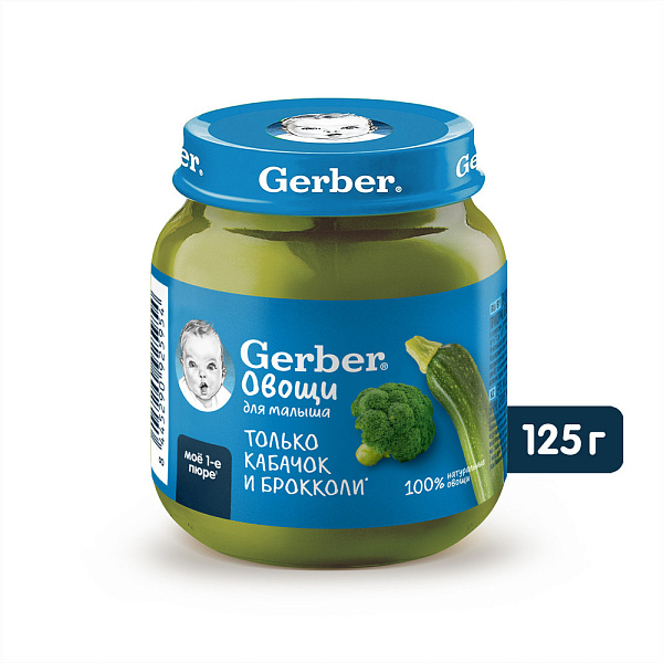 Gerber предлагает овощное пюре из 100% натуральных кабачков и брокколи для прикорма малышей с 5 месяцев. Продукт не содержит ГМО, консервантов, красителей и ароматизаторов.