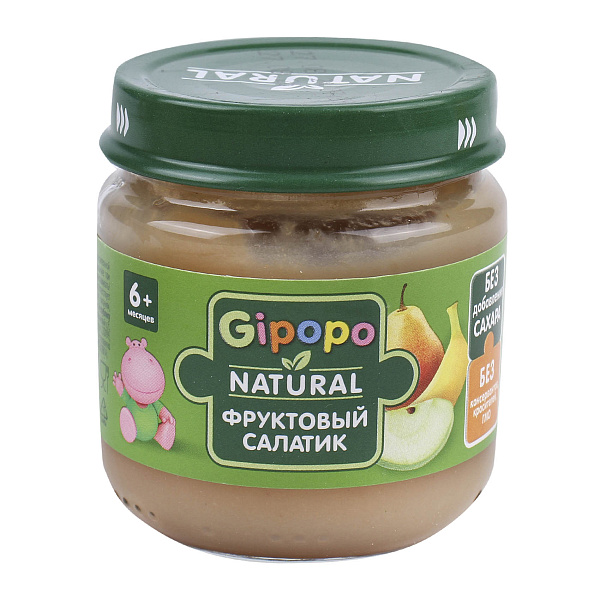 Пюре фруктовое Gipopo Natural «Фруктовый салатик» идеально подходит для первого прикорма малышей с 6 месяцев. Продукт упакован в удобную стеклянную банку массой 80 граммов, что обеспечивает легкость хранения и использования. Пюре сочетает в себе натуральный вкус яблок, груш и бананов, создавая богатый и питательный фруктовый десерт для младенцев.