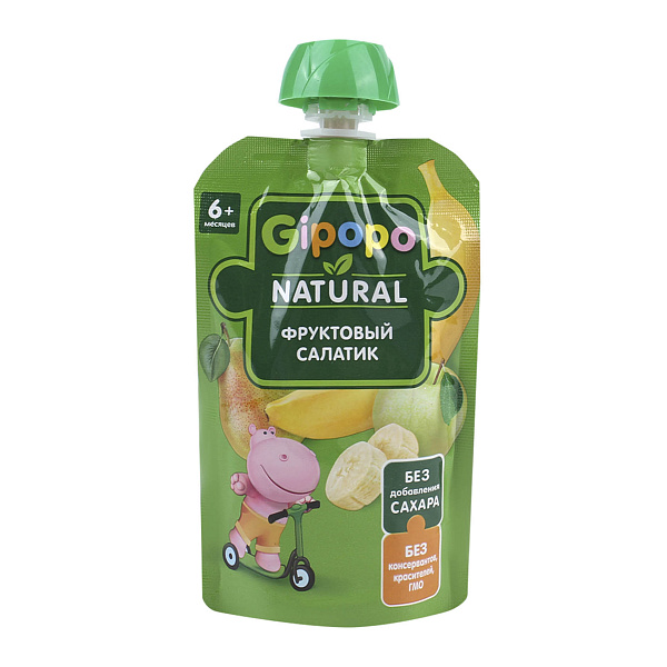 Пюре фруктовое Gipopo Natural «Фруктовый салатик» идеально подходит для прикорма малышей от 6 месяцев. Мягкая упаковка позволяет с легкостью кормить ребенка на прогулке или в дороге.