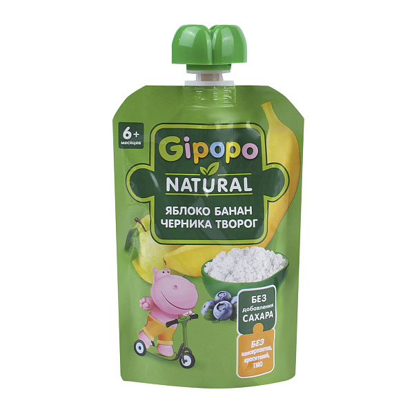 Пюре «Гипопо» с яблоком, бананом, черникой и творогом предназначено для питания детей с 6 месяцев. Инновационная комбинация вкусов и полезных ингредиентов делает этот продукт идеальным для первого прикорма и перекусов. Яркий фруктовый вкус и мягкая текстура пюре создают приятные вкусовые ощущения.