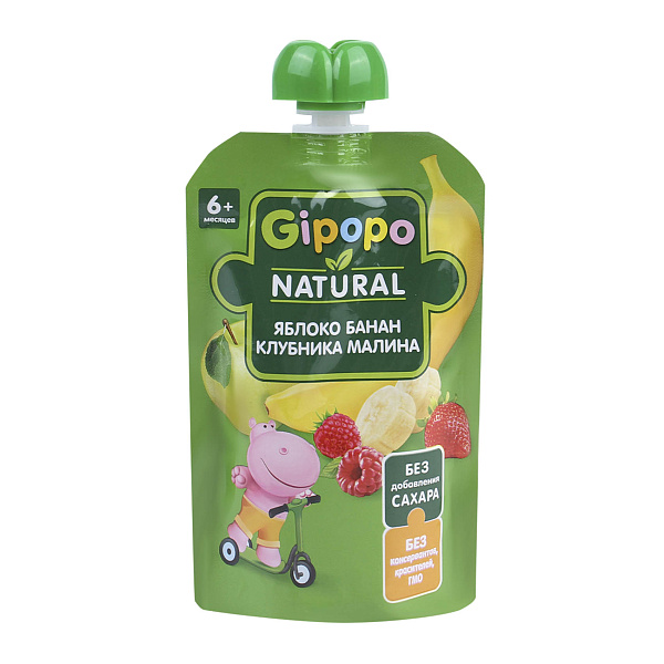 Фруктовое пюре Gipopo Natural – это идеальный выбор для прикорма малышей от 6 месяцев. В составе только натуральные ингредиенты: яблоки, бананы, малина и клубника. Пюре отличается отсутствием сахара, крахмала, красителей, ароматизаторов и консервантов, что обеспечивает натуральный вкус и безопасность для ребенка.