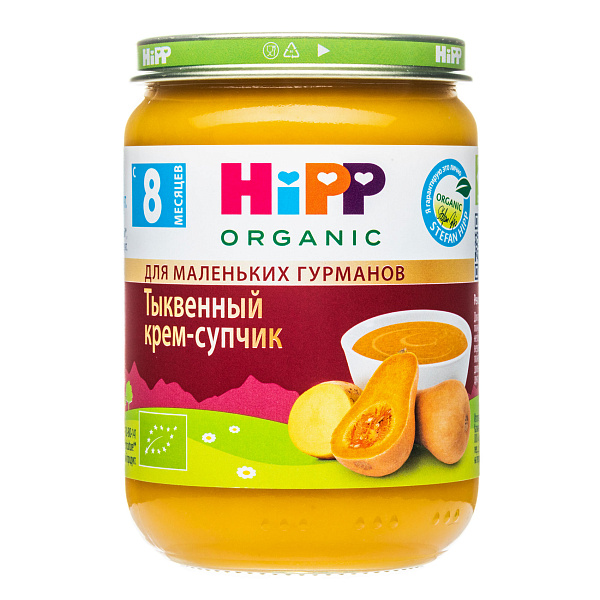 Пюре «Тыквенный крем-супчик» HiPP включает тыкву, картофель и рапсовое масло. Тыква богата витаминами и бета-каротином, поддерживающим зрение, кожу и иммунитет. Картофель также содержит бета-каротин, который превращается в витамин А.