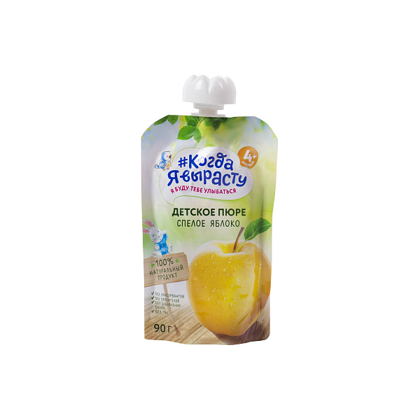 Популярное для первого прикорма яблочное пюре в пауч-упаковке под брендом «Когда я вырасту» натуральное. Так важно сохранить для ребенка пользу и естественный вкус спелого яблока, и российский производитель с этой задачей успешно справился. Для малышей старше 4 месяцев доступен оригинальный природный продукт без добавления сахара, красителей и консервантов. Внутри мягкой пачки с носиком только яблочное пюре и ничего лишнего. Пластиковая крышка надежно сохраняет содержимое от вытекания и комфортна для дозирования пюре на первом этапе прикорма. Вес – 90гр.