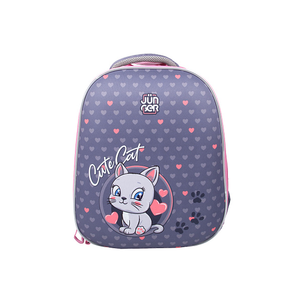 Корпусный ранец «Котенок в сердечках» сшит из плотной ткани фиолетового цвета, которую отлично дополняют молнии и фурнитура розового оттенка. Школьный ранец имеет легкий вес. Жесткий корпус обеспечивает сохранность содержимого. Три просторных отделения могут вместить все необходимое для школьных занятий. В одном из них поместятся все школьные учебники и тетрадки, а во втором отделении можно сложить канцелярские принадлежности. Боковые карманы, укрепленные по краю резинками, предназначены для бутылок с водой и других нужных предметов. Ортопедический ранец имеет мягкие S-образные лямки из нескользящего материала, которые регулируются по длине. Анатомическая спинка с мягкими элементами помогает распределить нагрузку на спину и плечи. Светоотражающие элементы, размещенные по периметру ранца, сделают прогулки в темное время суток более безопасными - ребенка с таким ранцем хорошо видно в свете фар и фонарей. Ранец особенно понравится девочкам, ведь он украшен принтом с изображением милого серого котенка, окруженного сердечками.