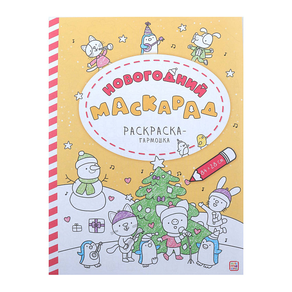 Центром этого издания является длинное непрерывное полотно для раскрашивания длиной 84 см, которое в сложенном виде компактно умещается в книжку. На нем разворачивается масштабная сцена Новогоднего Маскарада, где множество милых зверушек в карнавальных костюмах. Каждый уголок этого огромного изображения наполнен мелкими деталями, что делает процесс раскрашивания увлекательным и долгим, побуждая ребенка к внимательности и сосредоточенности.