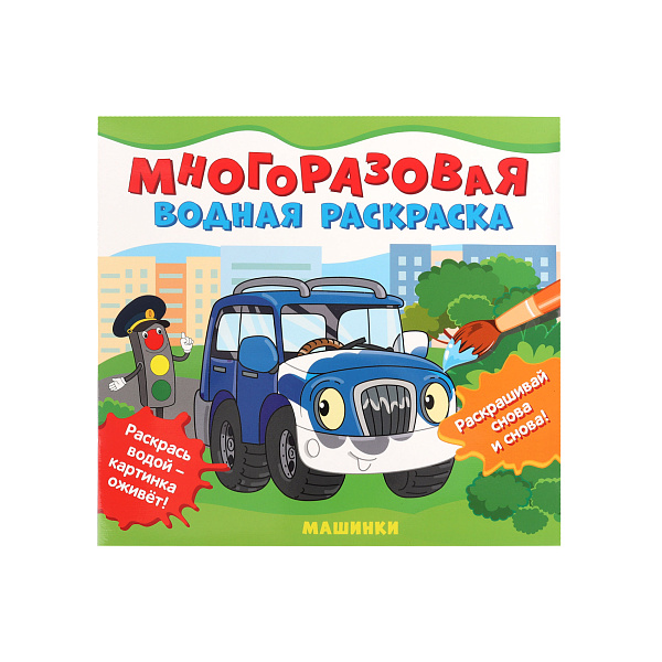 На каждой странице вместо изображений имеются белые пятна с контурами какой-либо картинки. Если провести по белой поверхности смоченной в воде кисточкой, появится цветное изображение автомобильчика. Изображение держится несколько минут, потом вновь исчезает. Поэтому «раскрашивать» книжку можно неоднократно.