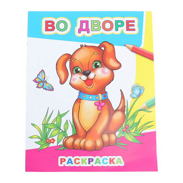 Раскраска «Во дворе» из серии «Звездочка» содержит изображения домашних животных: щенка, ослика, овечки и других. Каждая картинка подписана, что помогает запомнить названия зверей. Размер раскраски — 200х250 мм, она удобна для маленьких рук.