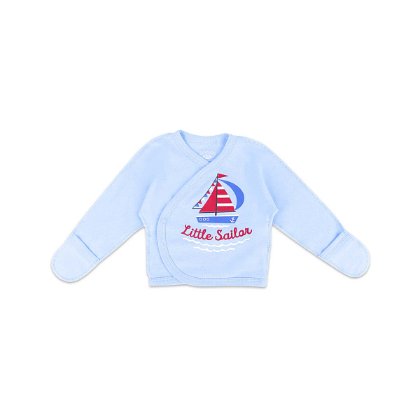 Для совсем маленьких детей существует свой аналог халата – это распашонки. Название говорит само за себя: кофточка застегивается лишь на одну кнопку, чтобы не беспокоить ребенка твердыми, жесткими деталями. Конечно, такой вид одежды подходит для совсем маленьких детей, которые еще спокойно лежат в кроватке. Для защиты кожи ребенка от собственных любопытных пальчиков с острыми ногтями, к распашонке пришиты специальные рукавички-царапки. Кофта изготовлена из стопроцентного хлопка в классическом голубом цвете. На груди нарисован сине-красный кораблик и есть надпись на английском «Маленький воин».