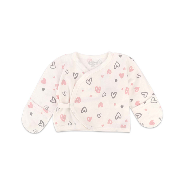 Распашонка свободного кроя с оригинальными рукавичками обеспечит все потребности девочки с самого рождения. Модель оформлена в нежной цветовой гамме, украшена миниатюрными изображениями сердечек. Для фиксации предусмотрена кнопка. Наружные соединительные швы не будут раздражать нежную детскую кожу. Дополнительные детали на рукавах позволяют защитить ребенка от собственных острых ноготков.