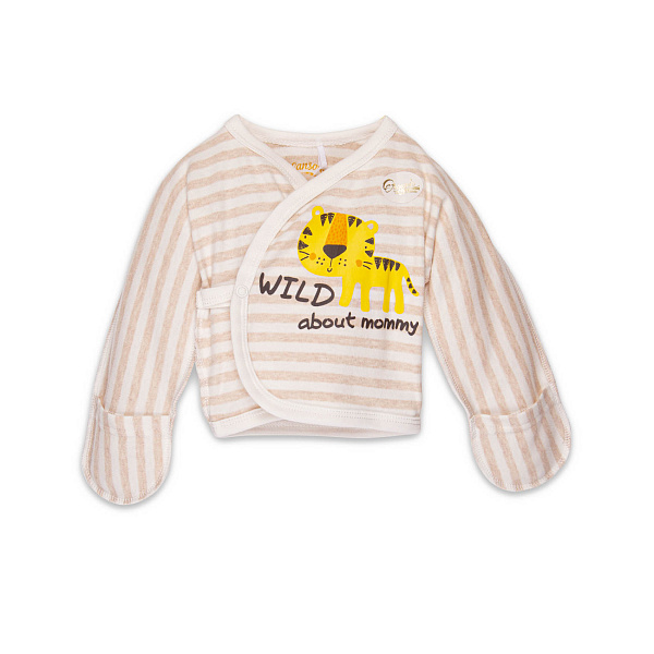 Очаровательная полосатая расцветка в сочетании белого и кремового цветов дополняется красочной цветной надписью и рисунком забавного льва на передней стороне распашонки. Модель с длинными рукавами, которые оканчиваются антицарапками. Все соединительные швы распашонки выполнены по наружной стороне, для исключения натираний нежной детской кожи в зоне контакта со швом. Внешние срезы окантованы косой бейкой белого цвета. Это не только придает изделию аккуратный внешний вид, но и предотвращает деформацию после стирки. Модель предполагает застежку на запах с использованием кнопок.