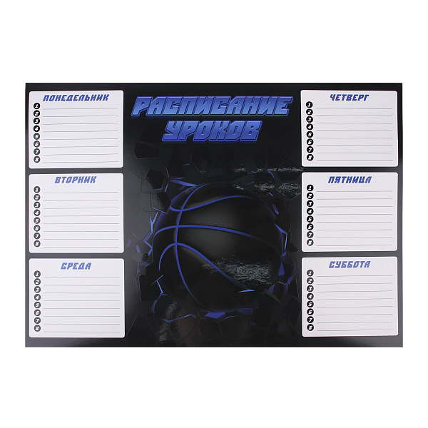 Большой баскетбольный мяч в центре расписания станет символом активности и стремления к успеху. Яркий элемент поднимет настроение и настроит на позитив. Расписание с баскетбольной тематикой поможет не только организовать учебное время, но и подчеркнуть увлечение спортом, приглашая к достижению новых высот