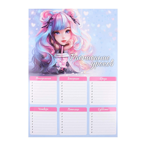 Расписание уроков А4 Девочка с бабл-ти» поможет не только успешно планировать учебные задачи, но и станет элементом декора, подчеркивающим индивидуальность хозяина.
