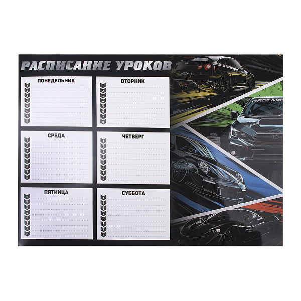 Расписание уроков «Неоновые тачки» — это не просто помощник в организации учебного времени, но и яркое украшение для любой детской комнаты. Стильный дизайн с изображением захватывающих неоновых автомобилей привнесет энергию и вдохновение в школьный процесс.