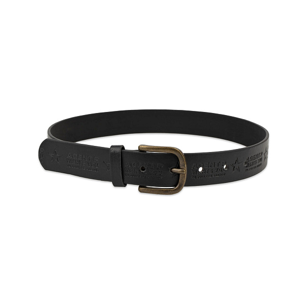 Полотно ремня гладкое с элементами декоративного тиснения в виде надписей и пятиконечных звезд. Также на ремне располагается тренчик, чтобы заправлять свободный конец ремня. Эффектный черный ремень будет чудесно смотреться, благодаря универсальному цвету и неброскому декору, чем порадует каждого мальчика.