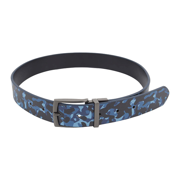 Одна сторона ремня выполнена в классическом темно-синем цвете, что делает его подходящим для официальных и повседневных нарядов. Другая сторона имеет яркий камуфляжный принт в синих тонах, добавляя стильный акцент любому образу. Легко меняется стиль с помощью поворота пряжки, что позволяет выбирать между строгим и более повседневным вариантом в зависимости от ситуации.