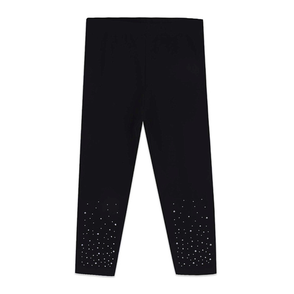 Стильные и практичные рейтузы для девочки черного цвета прекрасно подойдут для повседневного ношения. Рейтузы украшены белыми мелкими стразами на нижней части штанин, придавая изделию праздничный и нарядный вид. Прямой крой и эластичный пояс обеспечивают комфортную посадку без сдавливания.
