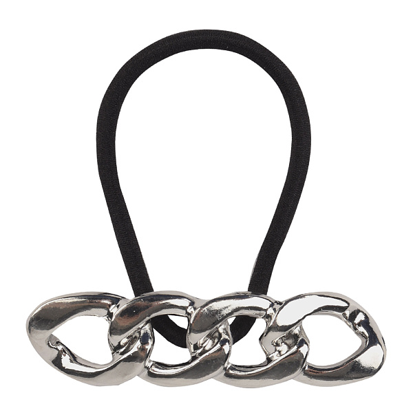 Стильная резинка для волос с серебристой цепью станет ярким акцентом в образе. Черная эластичная основа надежно фиксирует волосы, не причиняя дискомфорта и не оставляя заломов. Длина и ширина цепочки подобраны таким образом, чтобы она привлекала внимание, но не утяжеляла прическу.