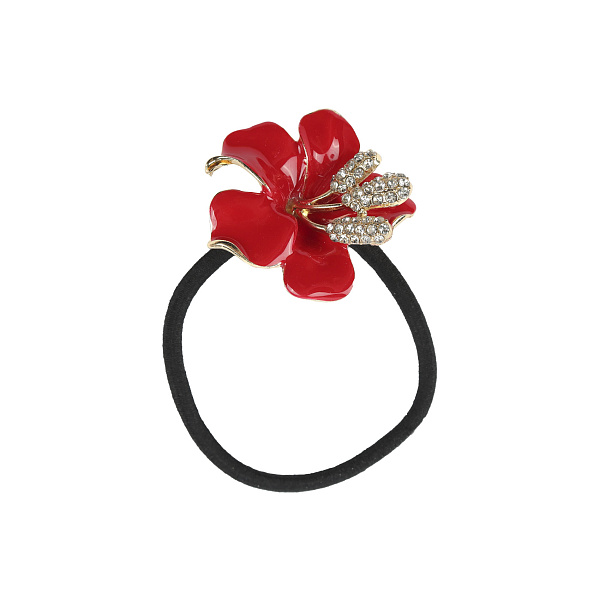 Модная резинка для волос представляет собой элегантный аксессуар с роскошным цветочным декором. Лепестки цветка имеют глянцевую поверхность и изогнуты таким образом, чтобы максимально передать естественные очертания живого цветка, а золотистая окантовка подчеркивает их изящные формы. В центре украшения, подчеркивая благородство лилии, располагаются блестящие стразы.