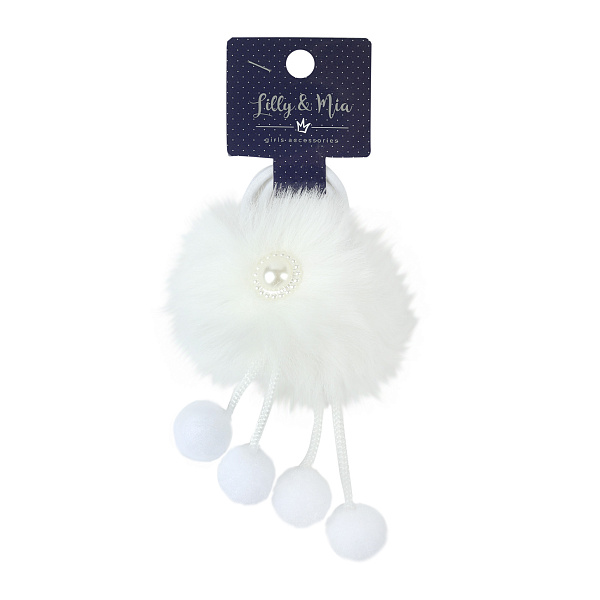 Белые резинки с элегантным пушистым декором украшены белой перламутровой бусиной и свисающими на шнурках помпонами. Этот аксессуар для волос дополнит праздничный наряд или школьный образ девочки.