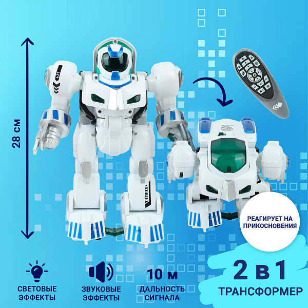 Робот-трансформер на радиоуправлении будет отличным развлечением для детей. В наборе находится сам робот и пульт дистанционного управления с радиусом действия до 10 метров. Корпус робота выполнен в футуристичном стиле. Голова робота оснащена прозрачным куполом.