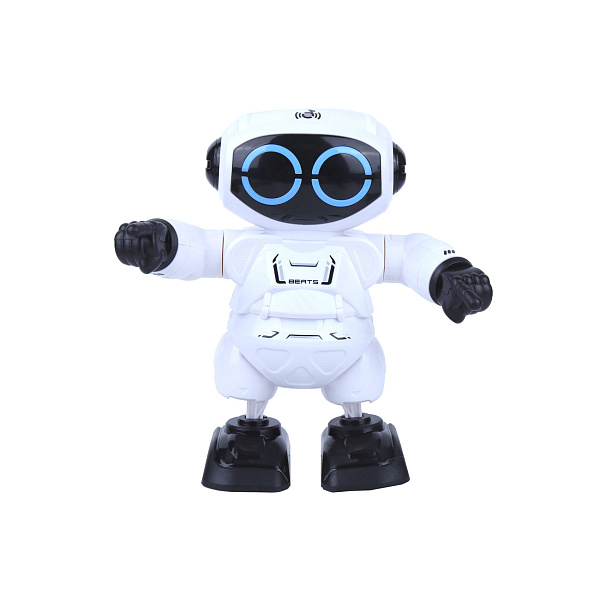 Белый робот с синими глазами, черным дисплеем и черными руками и ногами добавит приключений в игру. На груди находится черная фирменная надпись «Beats». На затылке находится кнопка включения и выключения. Робот умеет танцевать, петь и воспроизводить музыку. Танцует под два трека, можно переключать их с помощью кнопки на голове. Работает на батарейках (имеются в комплекте). Игрушка станет необычным дополнением коллекции ребенка или станет прекрасным подарком на памятную дату. Робот не только повеселит его, но и научит танцевать.