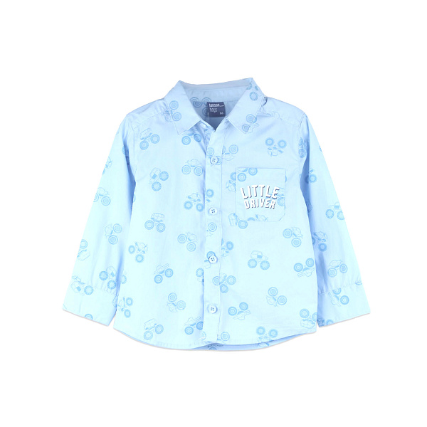 Рубашка пошита из прочной, мягкой и комфортной в носке ткани. Она точно понравится мальчикам, которые любят много двигаться и играть в подвижные игры. Цвет рубашки – голубой, поверхность декорирована принтами с изображением велосипедов. На кармашке вышита белая надпись.