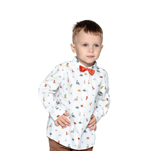 Нарядная рубашка для мальчика ясельного возраста дополнена декоративным галстуком-бабочкой по центру горла. Модель имеет отложной воротник, классический прямой крой и изготовлена из светлой натуральной хлопковой ткани с мелким принтом динозавриков. Материал, из которого пошито изделие, хорошо пропускает влагу и воздух. Модель с длинными рукавами имеет свободную посадку, поэтому не сковывает движения малыша. В такой рубашке ребенок будет выглядеть модно и стильно на праздниках и мероприятиях.