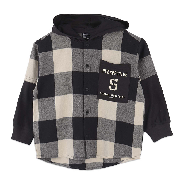 Рубашка для мальчика с длинными рукавами привлекает внимание стильным клетчатым дизайном. Яркое сочетание черного, серого и бежевого цветов создает современный и модный образ. Классический крой дополнен капюшоном, что делает рубашку подходящей как для повседневного ношения, так и для особых случаев.