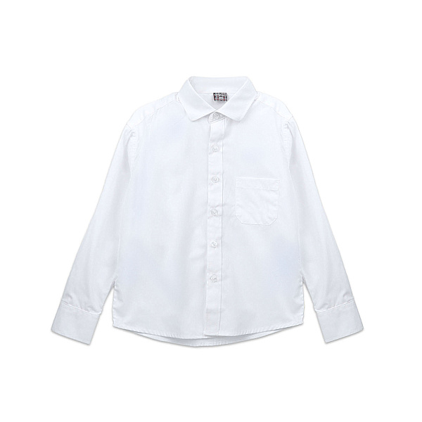 Праздничная рубашка для мальчика младшего школьного возраста сшита из смесовой ткани – 35% хлопка и 65% полиэстера. Изделие имеет прямой крой со свободным низом и длинные рукава с манжетами на пуговице. Застежка из пуговиц. Рубашка имеет открытый нагрудный карман. Воротник - отложной. Цвет - однотонный белый. Такая рубашка хорошо сочетается с костюмом-тройкой или школьной формой. В нее можно нарядить первоклассника на торжественную линейку 1 сентября. После приобретения рубашку следует постирать.