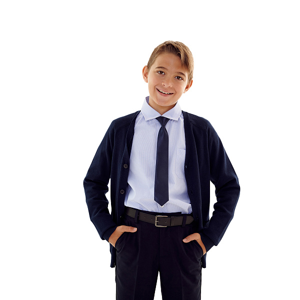 Рубашка для мальчика предназначена для универсального использования. Ее можно носить со школьной формой, использовать как праздничную или повседневную одежду. Состав материала рубашки – 50% хлопка, 50% полиэстера. Рукава - длинные с манжетами. Застежка - сквозная на пуговицах. Воротник - отложной классического типа. На левой стороне груди имеется накладной карман. Цвет сорочки - голубой с узором в виде вертикальных волнистых линий по всей поверхности материала. Силуэт - свободный. Это изделие отлично сочетается с джинсами, школьной формой, его можно носить без пиджака или куртки в теплую погоду.