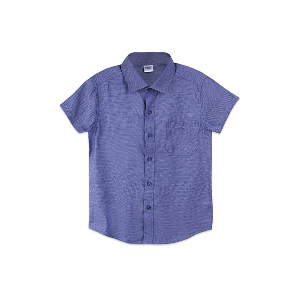 В жаркий летний день хорошим выбором для мальчика станет легкая рубашка с короткими рукавами. Она сшита из ткани, состав которой 45% хлопка и 55% полиэстера. Материал не мнется, смотрится нарядно, легко отстирывается. Сорочка имеет прямой крой, отложной широкий воротник. Застежка на пуговицах. Цвет изделия - однотонный синий со слабо выраженным узором из поперечных линий. Такая сорочка относится к неформальной одежде, она используется для повседневного ношения. Изделие можно надевать навыпуск или заправлять в брюки. Оно сочетается с брюками, джинсами, шортами.