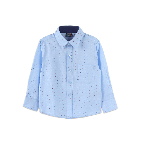 Голубая рубашка классического кроя с орнаментом в виде разноцветных горошин. Модель застегивается на пуговицы. Спереди на груди пришит небольшой карман. Воротник изделия дополнительно уплотнен, чтобы при носке он сохранял форму. Цвет яркий и насыщенный, будет эффектно смотреться со школьным костюмом, темными брюками, пиджаком или жилеткой.