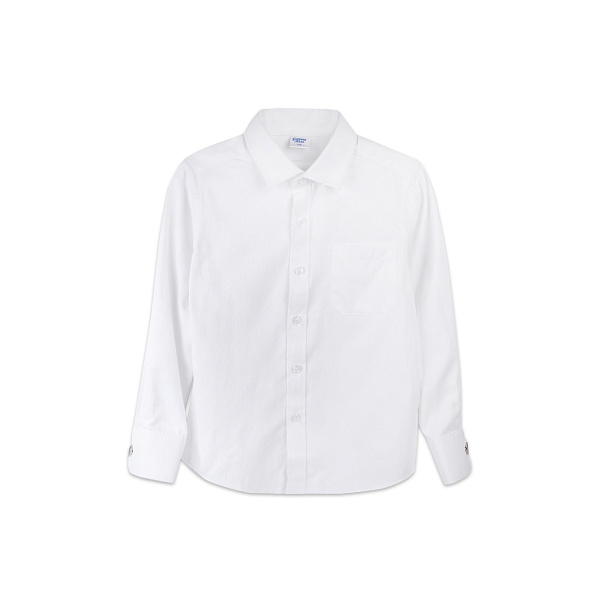 Такая рубашка предназначена для торжественных случаев, ее надевают в комплекте с официальным костюмом или школьной формой. Цвет рубашки - белый с принтом. Материал изготовления – 45% хлопок и 55% полиэстер. Такой состав хорош тем, что рубашка не мнется, легко гладится и сохраняет форму. Рубашка имеет прямой силуэт и классический покрой. Отложной воротник фиксируется верхней пуговицей. Рубашка застегивается на сквозную застежку из пуговиц в тон материалу. Рукава - длинные, заканчиваются манжетами с ченой пуговицей.