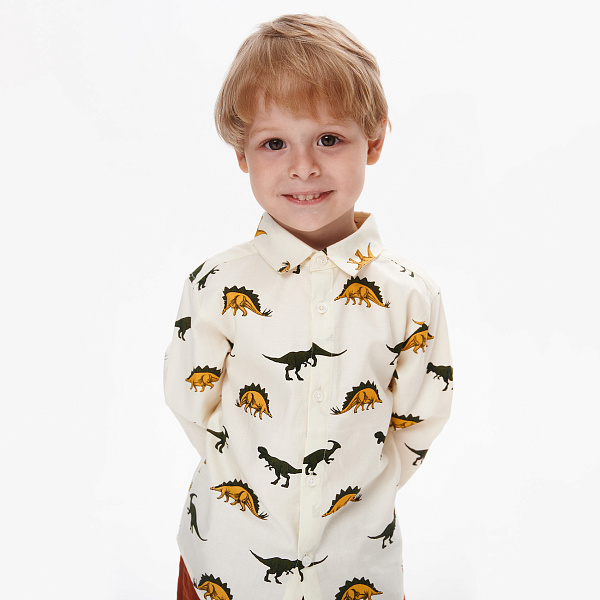 Милая хлопковая рубашка украшена веселыми изображениями динозавров. Она порадует маленького любителя древних ящеров не только своим дизайном, но и приятной дышащей тканью и удобной посадкой.