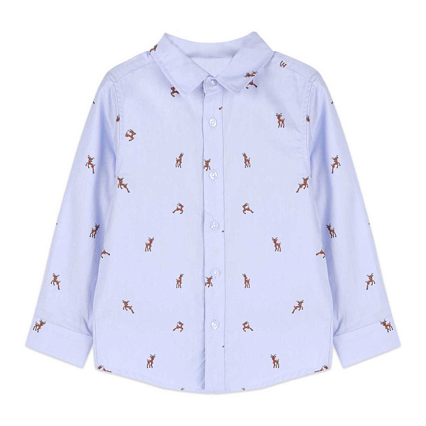 Голубой цвет изделия украшен забавным принтом с изображением оленей, придающим рубашке игривый и праздничный вид. Классический воротник и аккуратные пуговицы добавляют стиль, позволяя сочетать рубашку как с повседневной, так и с более официальной одеждой.