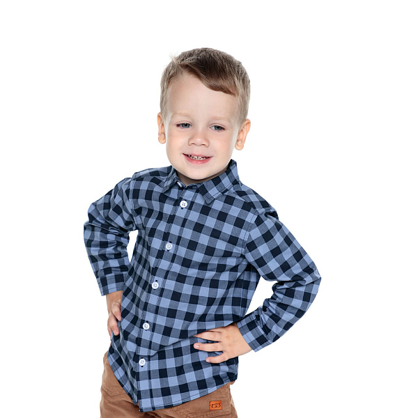 Идеальная рубашка предназначена для повседневной или праздничной носки для ребенка ясельного возраста. Она изготовлена из трикотажного хлопкового полотна в сине-голубую клетку. Материал хорошо пропускает воздух, приятно прилегает к телу и бережно сохраняет тепло. Рубашка имеет прямой крой, небольшой отложной воротник, манжеты и планку на пуговицах. Свободные рукава и крой не сковывают движения ребенка.