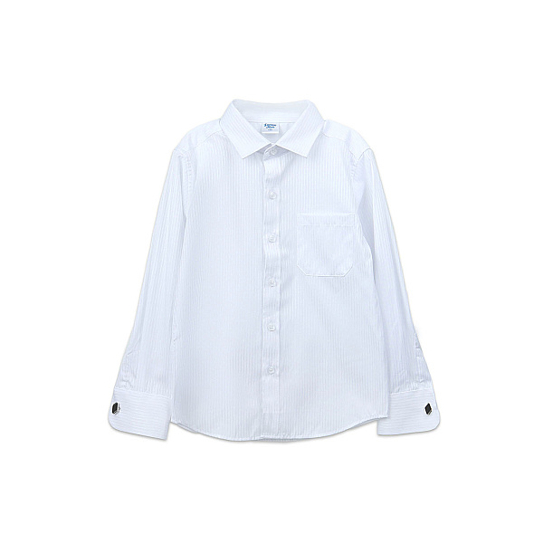 Комфортная и современная рубашка для мальчика сшита из смесового материала, состоящего на 45% из хлопка и на 55% из полиэстера. Покрой - классический прямой, расцветка - однотонная белая. Изделие имеет отложной воротник. На груди карман без застежки и клапана. Рукава - длинные с манжетами, которые застегиваются запонками. В такой рубашке ребенок будет отлично смотреться на торжественном мероприятии, она отлично подходит в комплект с выходным костюмом или школьной формой. Такая вещь точно должна быть в базовом гардеробе мальчика.