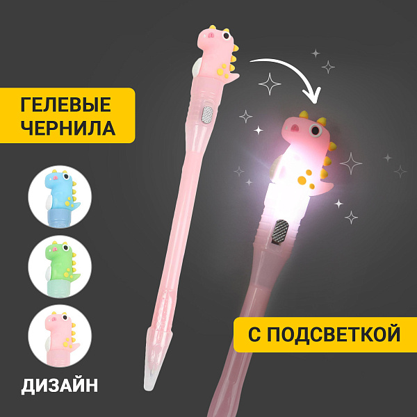 Гелевая ручка с фигуркой динозавра из цветного пластика привлекает внимание ярким и необычным дизайном. Фигурка на кончике ручки загорается ярким светом при нажатии кнопки. Такая ручка способна разнообразить скучные школьные будни. Ручка удобно ложится в детскую руку. Гелевые чернила позволяют писать четко и гладко.
