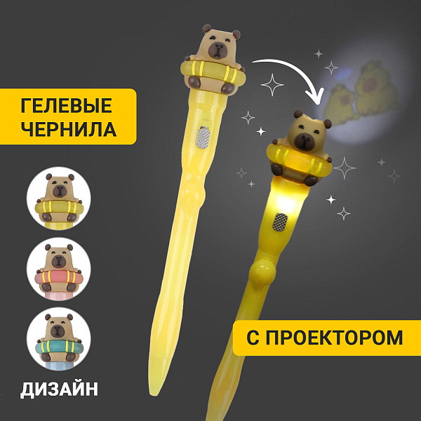 Особенность этой ручки — встроенный проектор. Для его активации достаточно нажать на специальную кнопку на корпусе. Проектор проецирует изображение с капибарой на любую плоскую поверхность, добавляя веселье в учебный процесс. Это может стать отличным способом развлечения на переменах или дома.