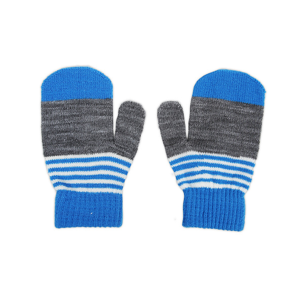 Мягкие демисезонные рукавицы порадуют не только своими характеристиками, но и привлекательным внешним видом. Варежки выполнены из плотного трикотажного материала на основе эластана и ПАН. Запястье плотно охватывается широкой вязаной резинкой. Расцветка аксессуара многоцветная, комбинация белого, синего и серого. Манжета и верх рукавиц отделения голубые, ладонь – голубая с белыми полосками, низ рукавичек и большой палей темно-серые. Такая расцветка одинаково хорошо будет смотреться на мальчиках и девочках. Рекомендовано для детей младшего возраста.