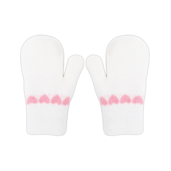 Зимние рукавицы предназначены для девочки дошкольного возраста. Они привлекают внимание нежной цветовой гаммой, декорированы сердечками. Трикотажная резинка исключает случайную потерю аксессуара. Изделие комфортно сидит на руке, не сковывает движения, не отвлекает ребенка от активных игр.