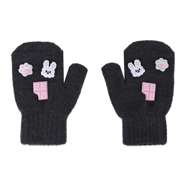 Темно-серые трикотажные рукавицы для детей, украшенные яркими декоративными элементами в виде лапки, мордочки зайца и молочного шоколада. Выполнены из качественного трикотажа, который обеспечивает мягкость и тепло, помогая сохранять комфорт в холодное время года.