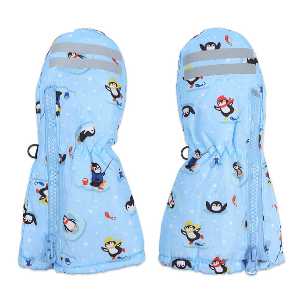 Зимние рукавицы (краги) выполнены из водоотталкивающей ткани голубого цвета с ярким разноцветным принтом пингвнов. Модель оснащена боковой застежкой-молнией, чтобы надевать и снимать изделие, а также эластичной резинкой на запястье для надежной фиксации и защиты от проникновения холода и снега.