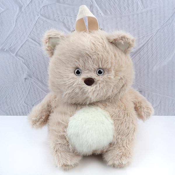 Выполнен из мягкого, пушистого плюша светло-бежевого цвета - приятен на ощупь и создает ощущение тепла и комфорта. Форма - круглая, с выразительными глазами, нежным носиком и короткими лапками - все это придает мишке добрый и забавный вид. На спинке - две широкие лямки из прочной ткани - они регулируются по длине и имеют мягкие подкладки, чтобы не давить на плечи.