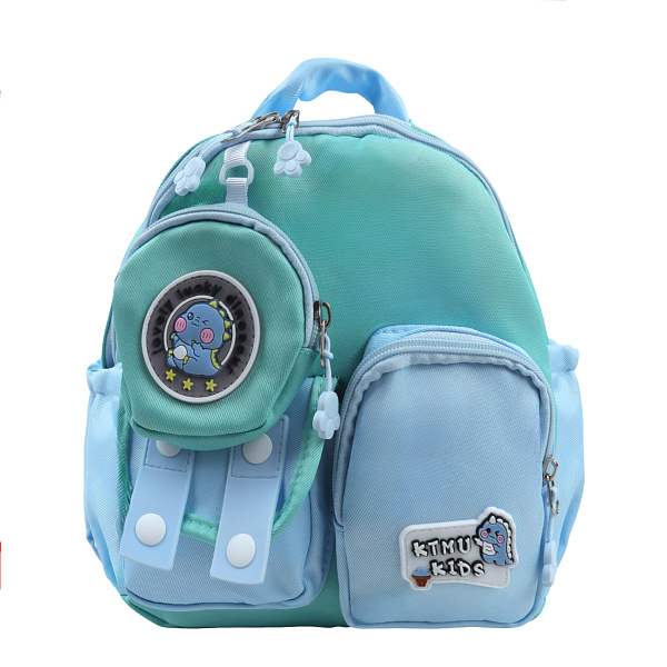 Выполнен из прочного полиэстера в приятной пастельной цветовой гамме: основной цвет - мятно-голубой, дополнен светло-голубыми и серыми элементами. Форма рюкзака - мягкая, округлая, что делает его безопасным для ребенка. Спинка и лямки обшиты сетчатой тканью - это обеспечивает вентиляцию и комфорт даже в жаркую погоду.